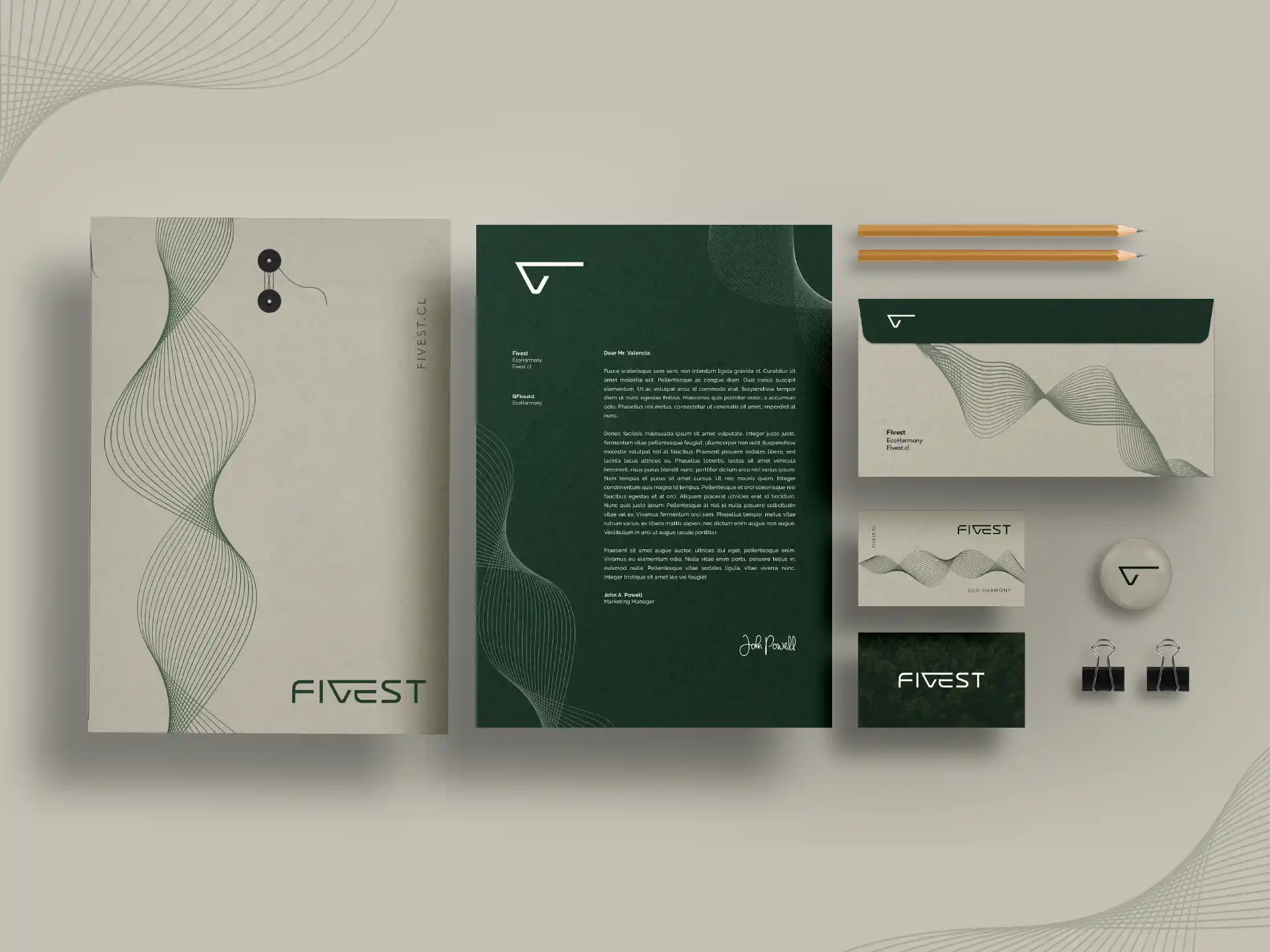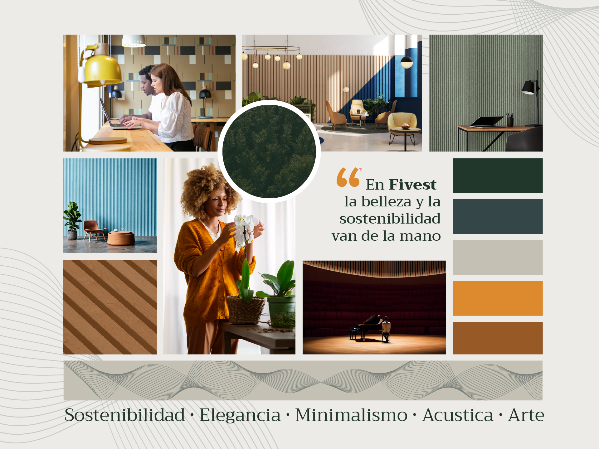 El branding de Fivest se construyó sobre una identidad visual que equilibra sofisticación, sostenibilidad y funcionalidad. Se seleccionaron las tipografías Trirong (serif elegante para títulos) y Avenir Next Pro (sans serif moderna para textos), logrando una estética contemporánea y clara. La paleta cromática combina tonos terrosos, verdes profundos y acentos cálidos, evocando naturaleza, calidez y lujo. Se incorporaron elementos gráficos como ondas acústicas en 3D y texturas naturales (madera, arena, hojas), reforzando su vínculo con el entorno y la acústica. Las fotografías muestran espacios reales bien iluminados y minimalistas, mientras que los iconos y el moodboard sintetizan los valores clave de la marca: arte, comunidad, sostenibilidad y diseño acústico. Todo el sistema busca transmitir una experiencia sensorial, moderna y armónica.