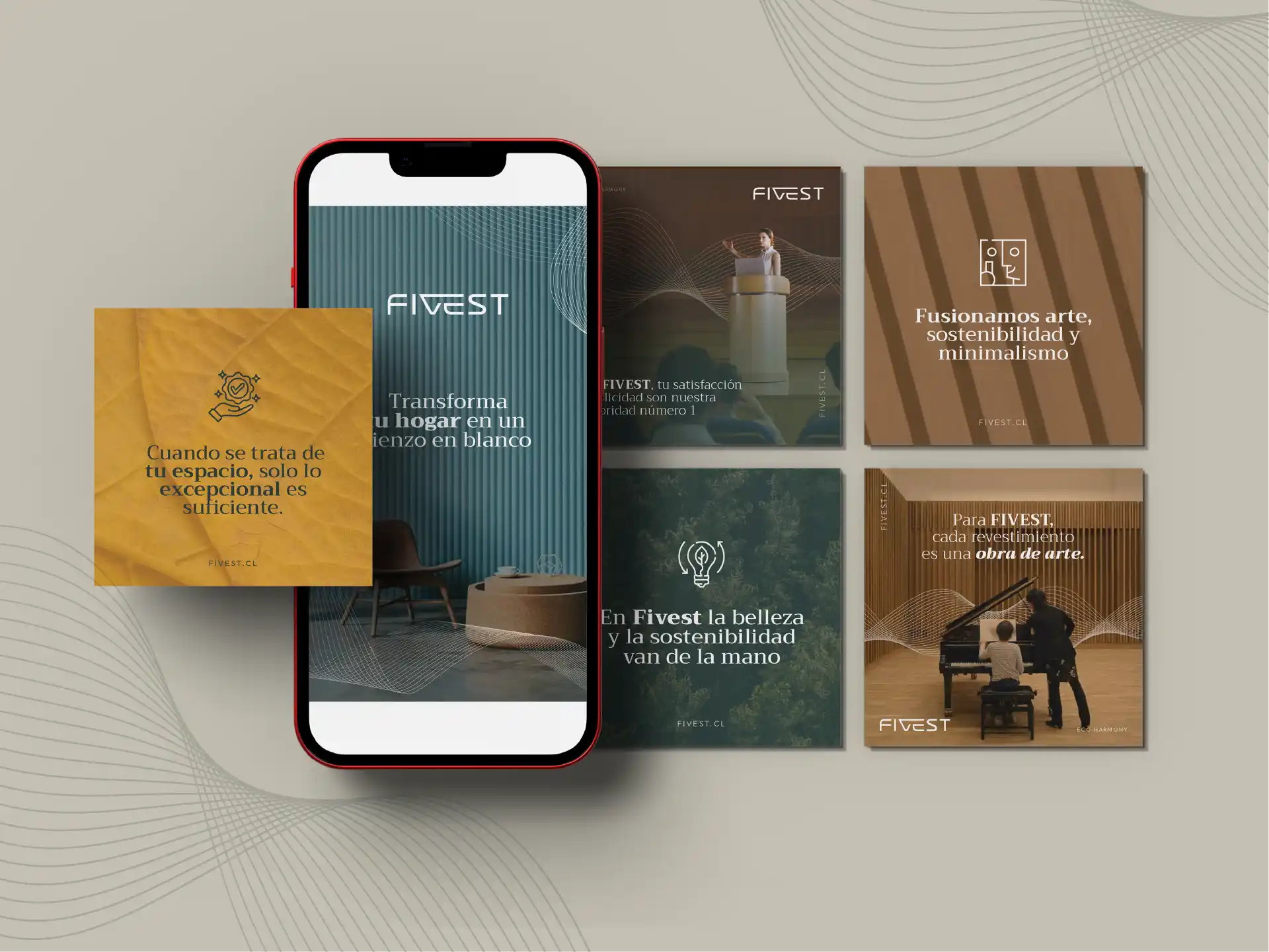 Fivest es una empresa chilena especializada en revestimientos con un enfoque en paneles acústicos decorativos de madera. Sus soluciones combinan diseño y funcionalidad, aportando estilo y confort acústico a diversos espacios. En cuanto a la colaboración con Efeonce, se desarrolló una estrategia integral de comunicación y diseño para fortalecer la identidad visual de Fivest en el mercado. Las acciones implementadas incluyeron: desarrollo de la guía de estilo e identidad visual, asegurando coherencia y reconocimiento de marca en todas sus aplicaciones.